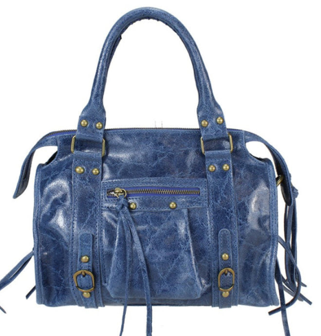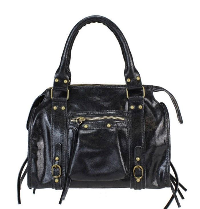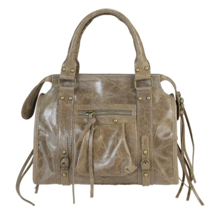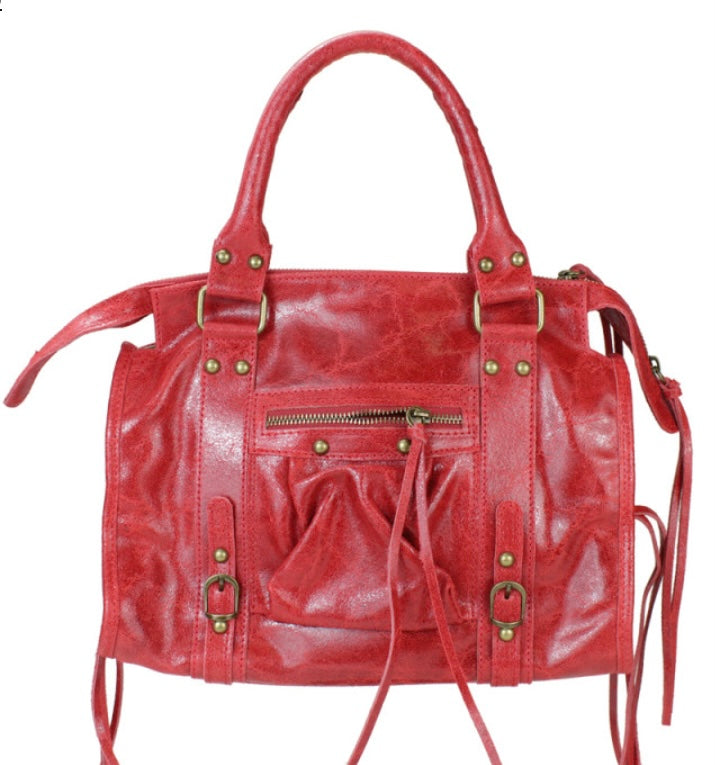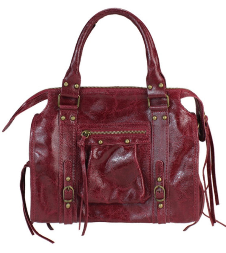 The Candy in the large size. Made from rugged vintage leather and distressed brass hardware is a must for Fall. Can be worn on the arm or crossbody with the leather strap that is included. Has 1 compartment with pocket.