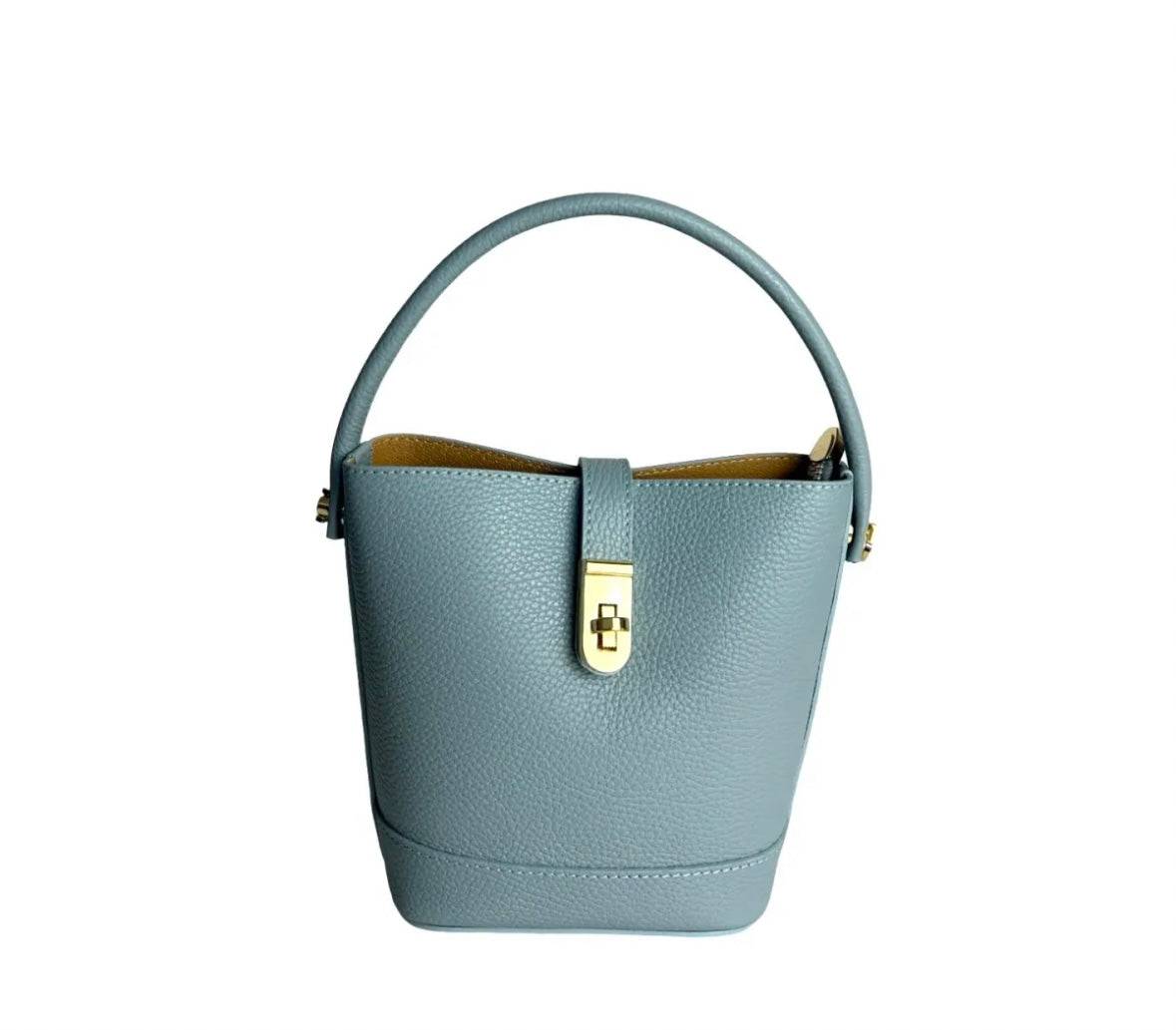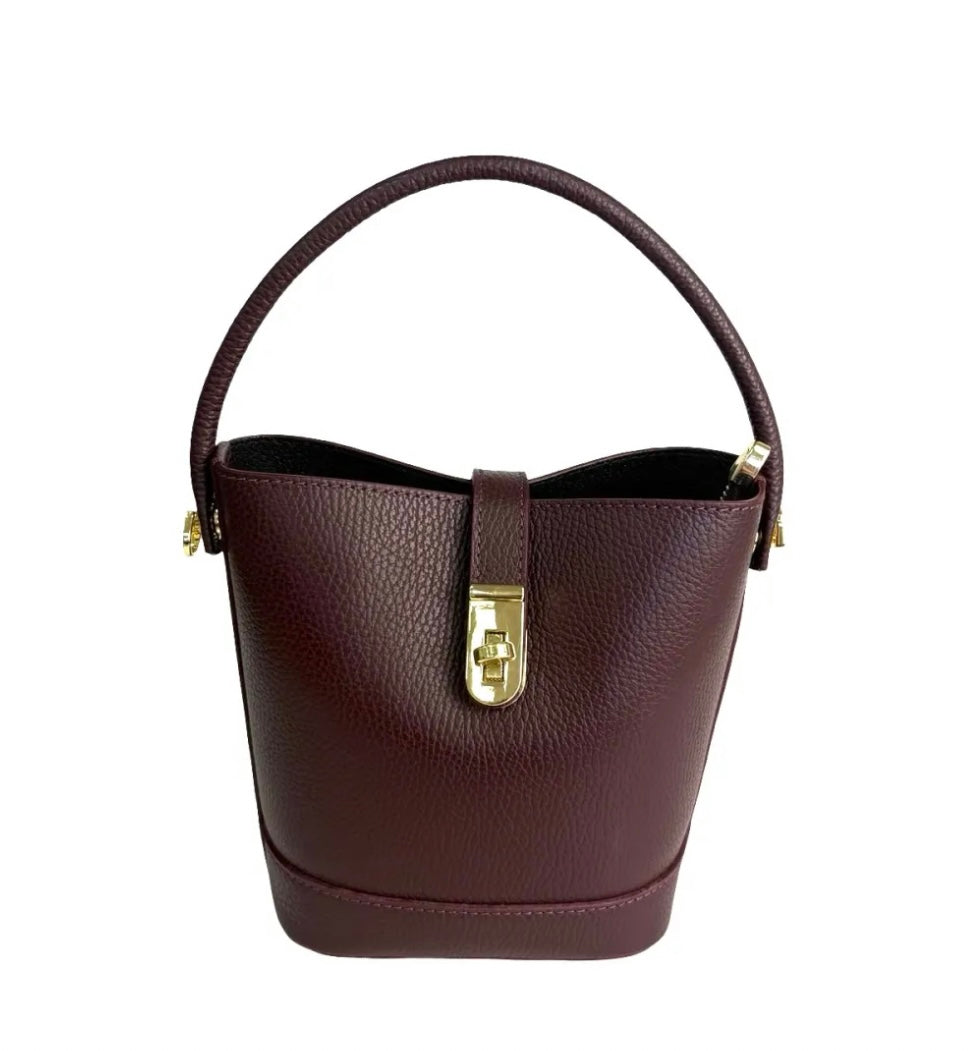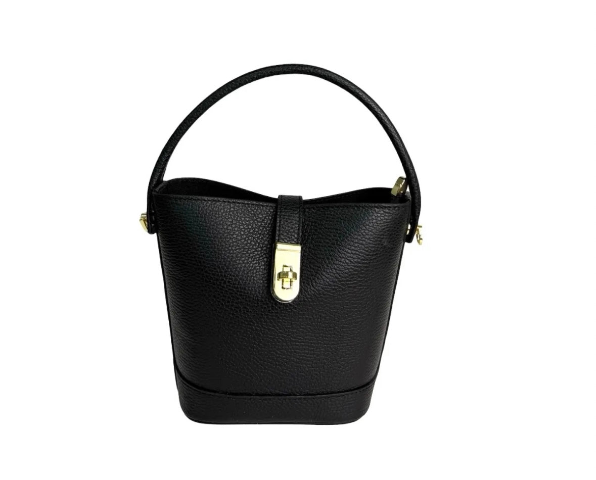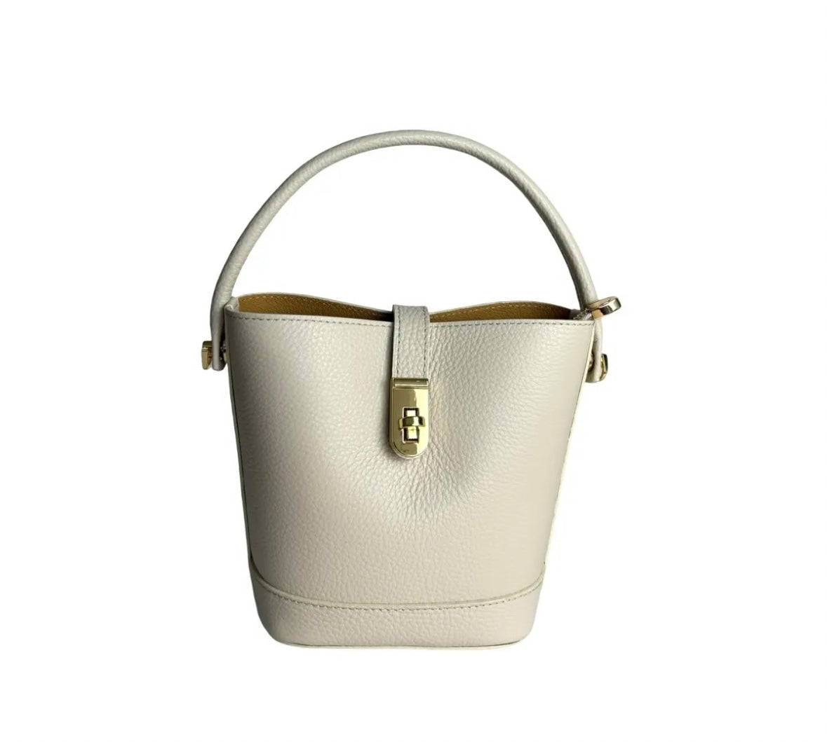 A compact, structured bucket bag with a pebbled finish, top handle, and gold-tone turn-lock closure—minimal, practical, and effortlessly chic.