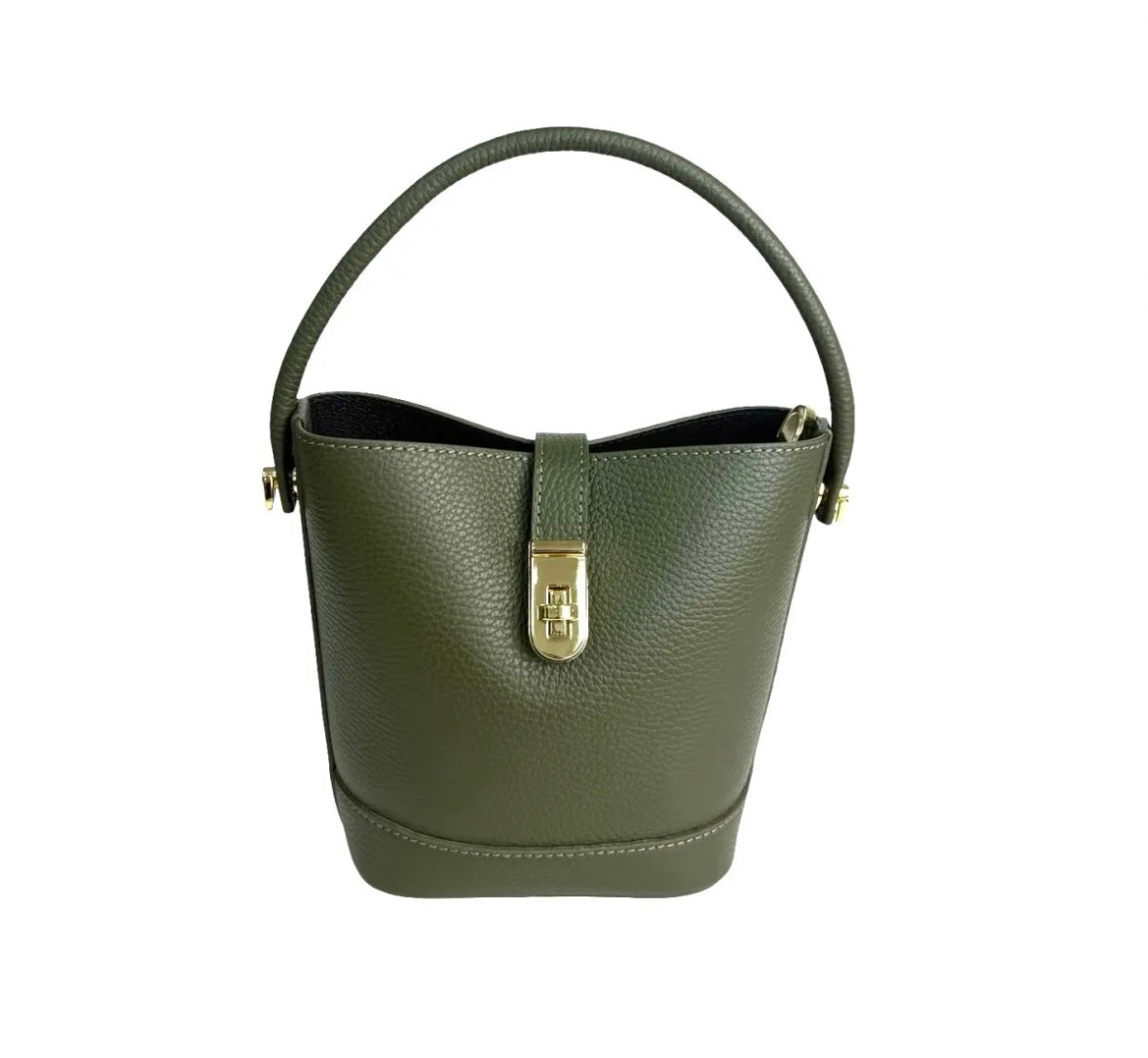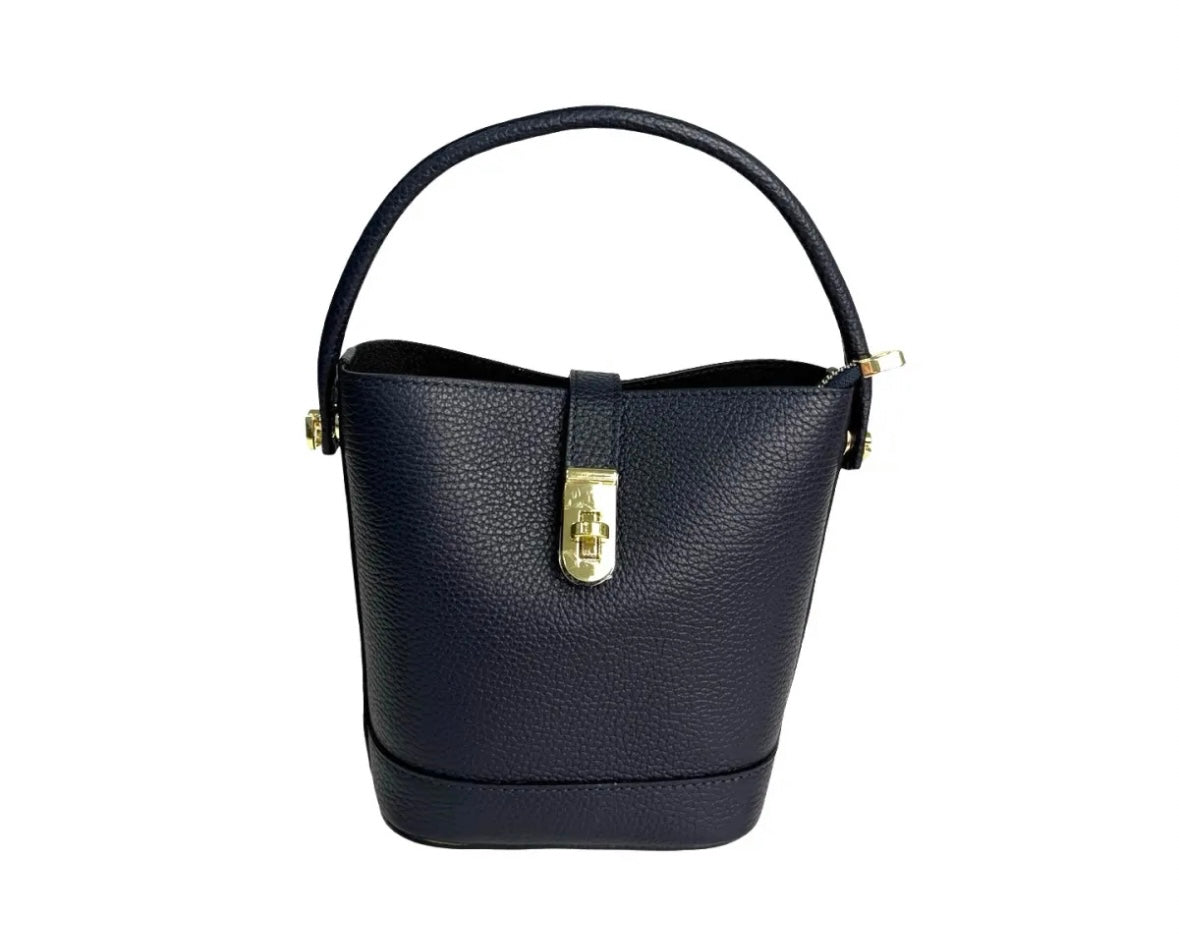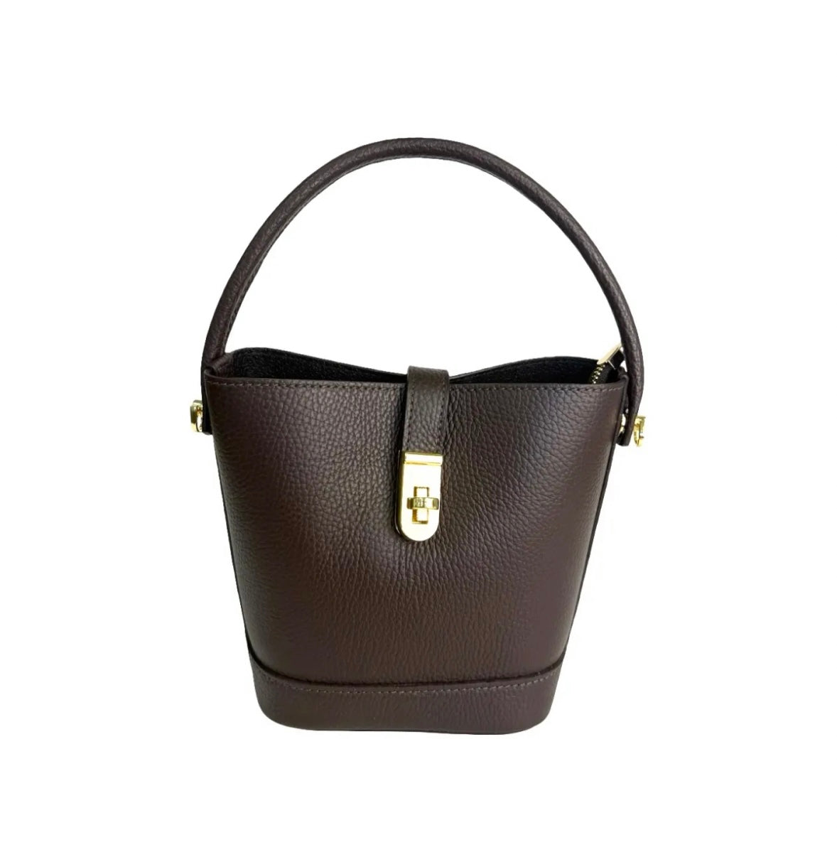 A compact, structured bucket bag with a pebbled finish, top handle, and gold-tone turn-lock closure—minimal, practical, and effortlessly chic.