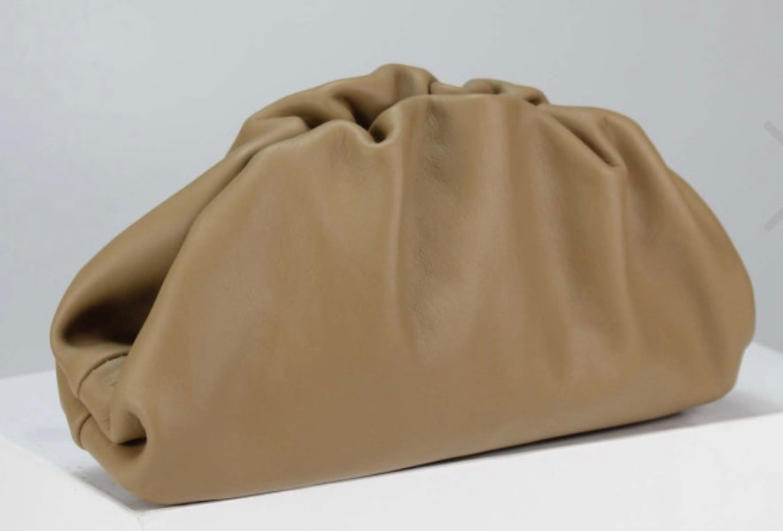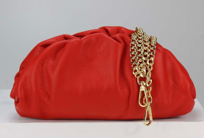 Trendy and elegant smooth laminated metallic leather clutch bag with detachable chain crossbody strap. Can be worn as a clutch or crossbody with inside compartment