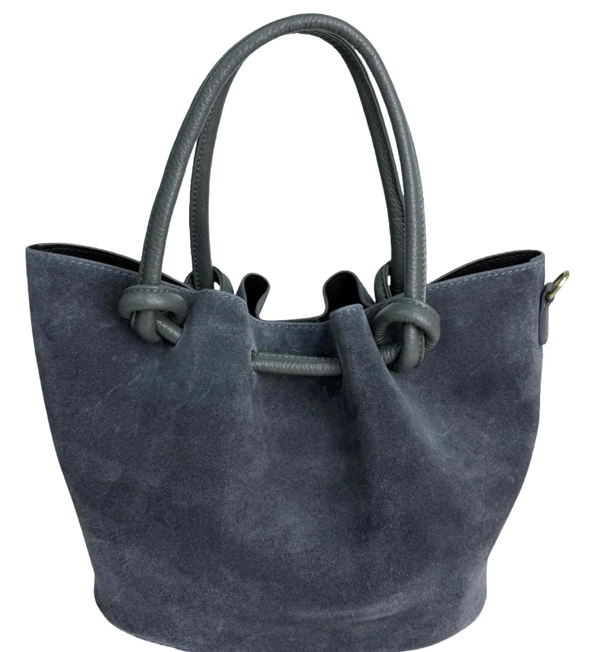 Unique shaped Experience luxury and convenience with Rico, the unique two handle tote. Made with soft suede and featuring gold hardware, this tote is both stylish and functional. The magnetic closure keeps your belongings secure, while the inside zippered detachable pouch and adjustable leather crossbody strap provide added versatility. Elevate your style with Rico!
